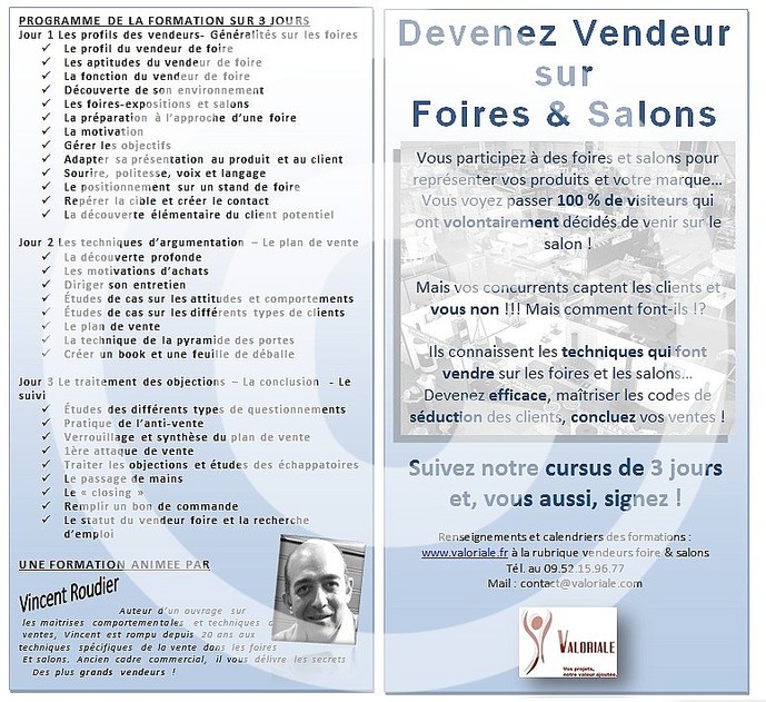C'est dans ce contexte que VALORIALE FORMATION vous propose une formation de 3 jours pour professionnaliser vos techniques, vous imprégner totalement de la culture "salon" et vous permettre de capter ces clients qui partent chez vos concurrents parce que , chez eux, il y a un excellent vendeur sur leur stand...